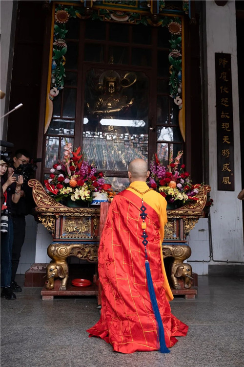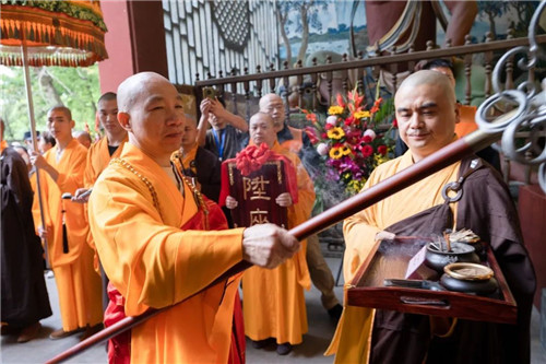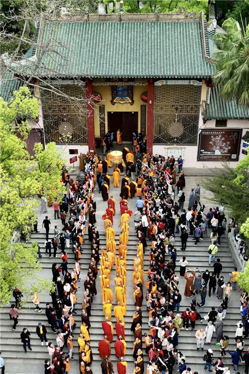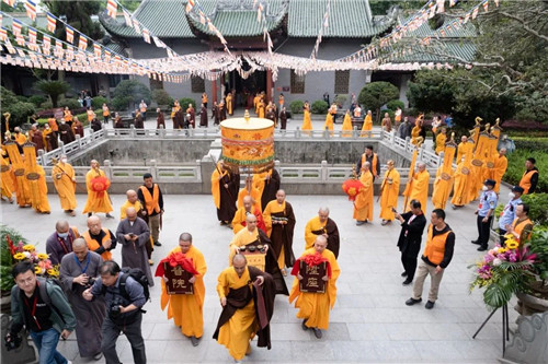 仪仗队缓缓前行,经过宝林门、伽蓝殿、祖师殿、放生池,来到大雄宝殿。中国佛教协会副会长、广东省佛教协会会长明生大和尚为法广大和尚送位。和尚偈曰: