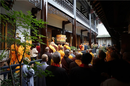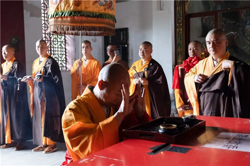 授具完毕,两序大众站班恭迎。维那师在大殿三敲大磬,出班恭请大和尚。监院捻香展具三拜,胡跪合掌白文,法广大和尚回文。寺内钟鼓齐鸣,在“晋院”“升座”牌引导下,庄严的仪仗队护持法广大和尚手持如意,缓缓步入山门。