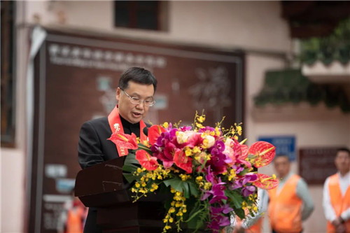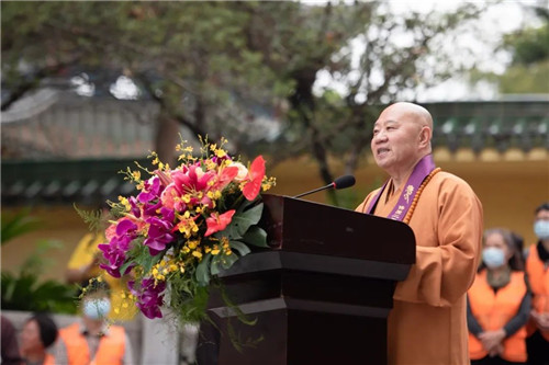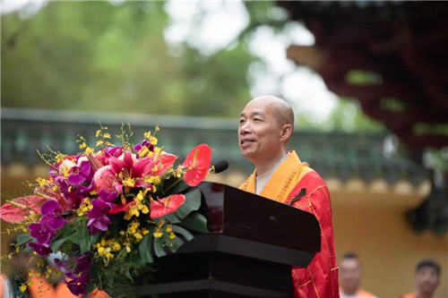 随后,中国佛教协会副会长、广东省佛教协会会长明生大和尚宣读中国佛教协会贺电并致辞,发扬好六祖顿悟法门是我们的历史担当。应当牢记惟因老和尚等南华禅寺中兴法师,学习传正大和尚为法忘躯,将自己一生身心慧命奉献给南华禅寺,才有今天庄严的祖师道场,相信法广法师一定能继承祖业,勇猛精进,爱国爱教,努力开创佛教中国化新形态,学修并重,法轮常转,普利众生,守正创新,使六祖人间佛教理念走出韶关,走出中国,成为世界有价值有人文关怀的宝藏,为社会和谐带来光明普照。
