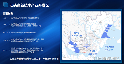据介绍,汕头高新区于1992年4月筹办,1993年7月经省政府批准为省级高新区,2017年2月经国务院批准升级为国家高新区,分东、西片区和六合产业园,总规划面积超60平方公里。