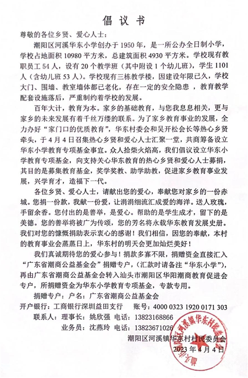 华东村党委书记吴茂才表示,在上级党委政府的坚强领导下,在吴开松先生等热心乡贤的关心支持下,华东村集体经济持续稳步发展,基础设施建设日益完善,村容村貌焕然一新,全村呈现安居乐业、和谐共处的良好局面。在吴开松先生等热心乡贤的大力支持下,我村计划筹备设立华东教育专项基金,该基金旨在奖励教学突出的教师和品学兼优的学生,培育有识、有为、有素质的优秀人才。在此,我谨代表华东村党委、华东村委会向在座各位以及所有关心、支持华东村建设和发展,并为之做出贡献的热心乡贤致以崇高的敬意和衷心的感谢。希望更多乡贤和热心人士为教育专项基金的筹备慷慨解囊、奉献爱心,齐心协力为华东教育事业高质量发展贡献力量!