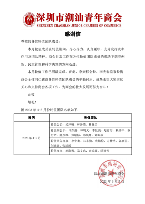 6-7月轮值会长李奕庄感谢4-5月份轮值团队的辛勤付出。她表示,今年是深圳潮青商会成立十周年,推行轮值制度六周年。轮值制度实行以来,得到商会常务副会长、副会长、常务理事、理事的大力支持,共计近2000人次参与轮值工作。六年来,我们不断总结轮值经验、优化服务模式,助推潮青成长接班、创新和发展,联谊学习、创业创新、投资合作、青春党建、华体会电子直播、国际交流等六个平台同步发展。商会现已发展成为拥有1100多家成员企业,拥有40多位人大代表、政协委员,拥有近220名中共党员,党委拥有九个支部的学习型创新型青年社团。