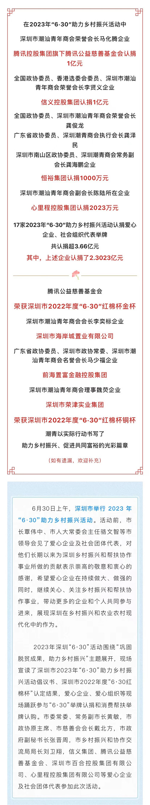 2.3023亿元!腾讯、信义、恒裕及心里程等企业在深圳市2023年“6·30”助力乡村振兴活动中认捐
