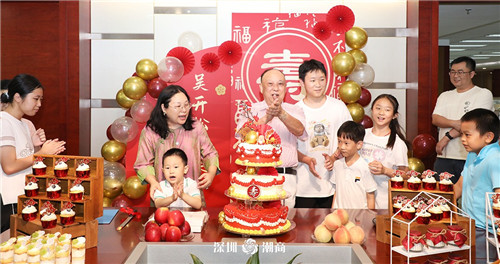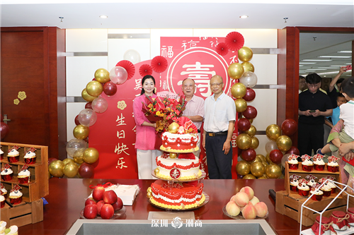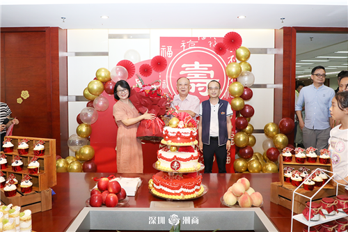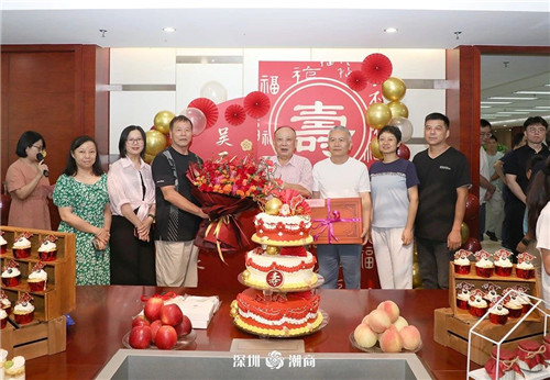 深圳潮青商会轮值会长李奕庄、王剑、驻会会长黄坚泰代表商会为吴开松会长送上祝福,并感谢吴开松会长多年来对深圳潮青商会的关怀与支持,恭祝他生日快乐、福如东海、寿比南山。