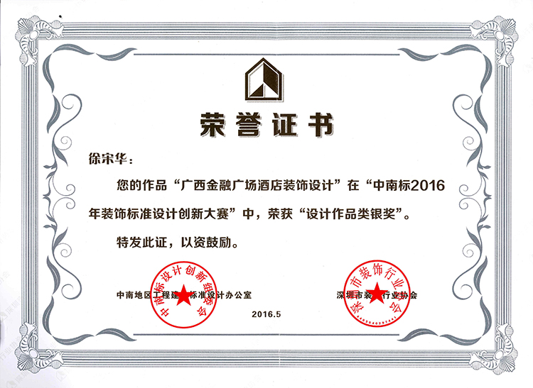 在颁奖环节中,宝鹰集团设计院徐宗华和杨详华的参赛作品《广西金融广场酒店装饰设计》、设计院伍曦的参赛作品《深圳宇商小额贷款有限公司装饰设计》均荣获“中南标2016年装饰标准设计创新大赛”的设计作品类银奖。