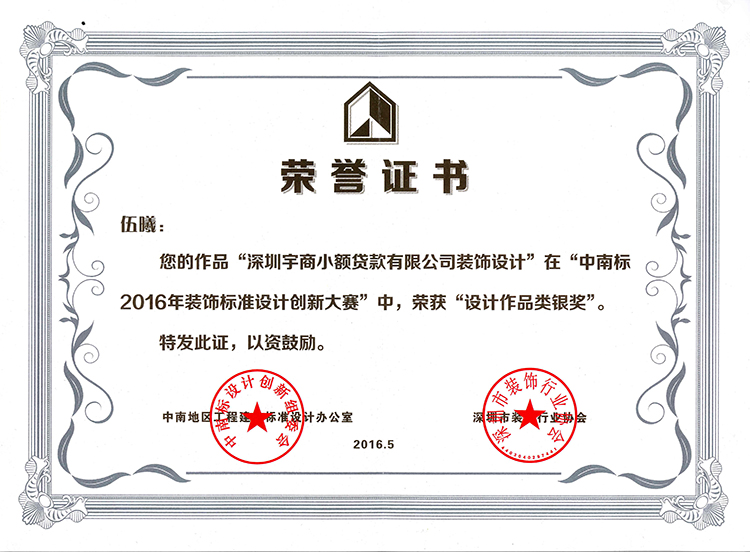伍曦《深圳宇商小额贷款有限公司装饰设计》荣获设计作品银奖