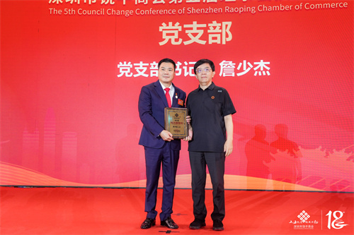 中共潮州市委常委、饶平县委书记、潮州港经济开发区党工委书记、闽粤经济合作区(潮州) 党工委书记陈跃庆为刘海景会长颁发深圳市饶平商会永远荣誉会长牌匾,为詹表会长颁发深圳市饶平商会第五届会长牌匾。