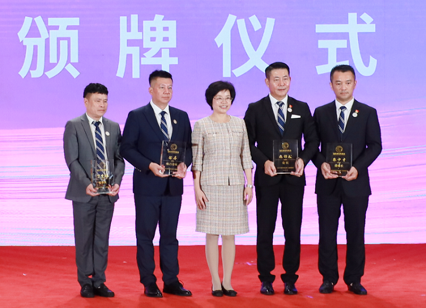 刘文华为汕头市青年商会会长林锦松、执行会长徐丹、理事长蔡少才、监事长丁建伟授牌