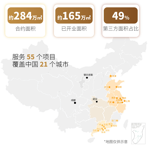 报告期内,集团扎根大湾区,布局全国化,在营项目保持增长势头。于2023年12月31日,商业运营服务的合约建筑面积约为284万平方米(当中49%由第三方开发或拥有),已开业项目面积165万平方米,筹备中项目20个,为未来发展提供确定性。全年累计同店销售较2022年增长18%,累计同店客流较2022年增长39%。