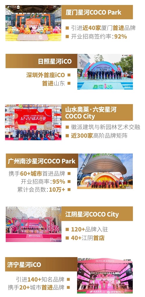 集团坚持有质量的开业,为业绩增长提供有力保障。完成2023全年新开业6个项目的目标,且均为集团的首进城市/区域,厦门星河COCO Park、日照星河iCO、山水奥莱·六安星河COCO City、广州南沙星河COCO Park、江阴星河COCO City、济宁星河iCO等项目的精彩开业受到业界好评,对强振地方经济起到重要作用。