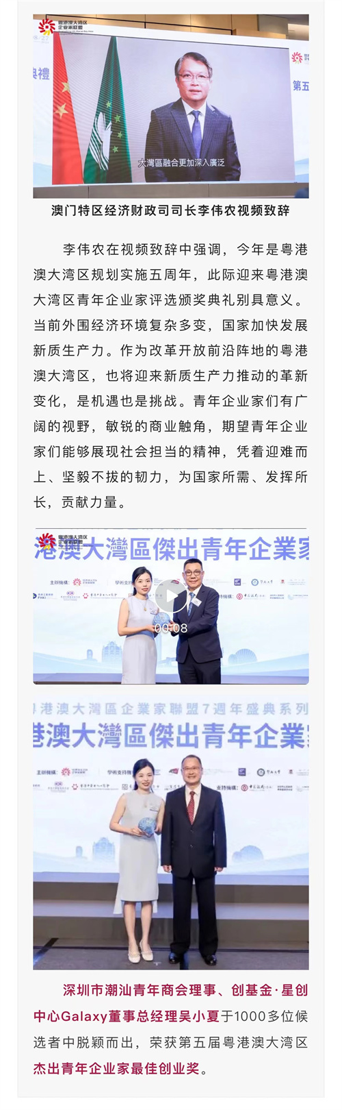 热烈祝贺创基金·星创中心Galaxy董事总经理吴小夏荣获第五届粤港澳大湾区杰出青年企业家最佳创业奖