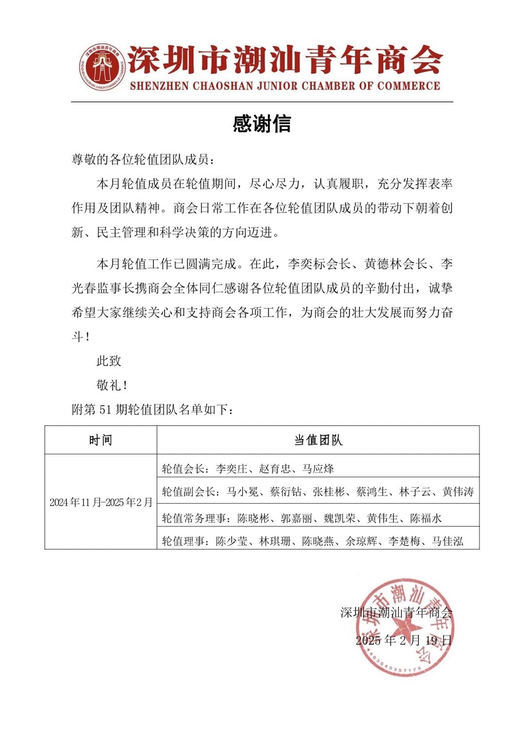 赵育忠表示,一批批优秀潮青加入商会平台,商会会员队伍不断扩大,社会各界评价越来越高,影响力不断提升,这离不开商会成员的团结合作和奉献付出。第51期轮值团队成员积极履行责任和义务,贡献时间、精力、资源和项目等,组织开展国际交流、参观考察、联谊学习、创业创新等形式多样的活动,为商会高质量发展做出了应有的贡献,同时也收获了宝贵的经验,为潮青事业高质量发展做出了有益的探索。