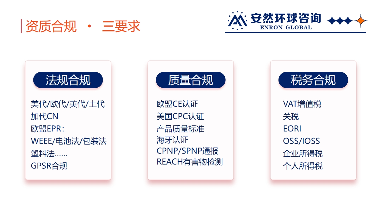 Morgan介绍,在理清“跨区域与国家、跨市场与文化、跨平台与产品”的逻辑关系后,产品资质也必须合规,一是法规合规,包括美代授权、欧代授权、英代授权,欧盟EPR,WEEE/电池法/包装法/塑料法,GPSR合规等;二是质量合规,包括欧盟CE认证、美国CPC认证、产品质量标准、海牙认证、CPNP/SPNP通报、REACH有害物检测等;三是税务合规,包括VAT增值税、关税、EORI、OSS/IOSS、企业所得税、个人所得税等。