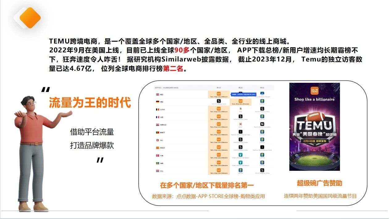 TEMU女装运营专家介绍,TEMU跨境电商是一个覆盖全球多个国家/地区、全品类、全行业的线上商城。2022年9月在美国上线,目前已上线全球90多个国家/地区,APP下载总榜/新用户增速均长期霸榜。TEMU通过不同模式高效助力中国商家出海,其中全托管模式特点是国内交货,返单响应需及时;入驻门槛低,适合工厂型商家;一店卖全球。半托管模式是自由选择仓储物流方案,适合成熟品牌商家,海外有备货,分站点售卖。