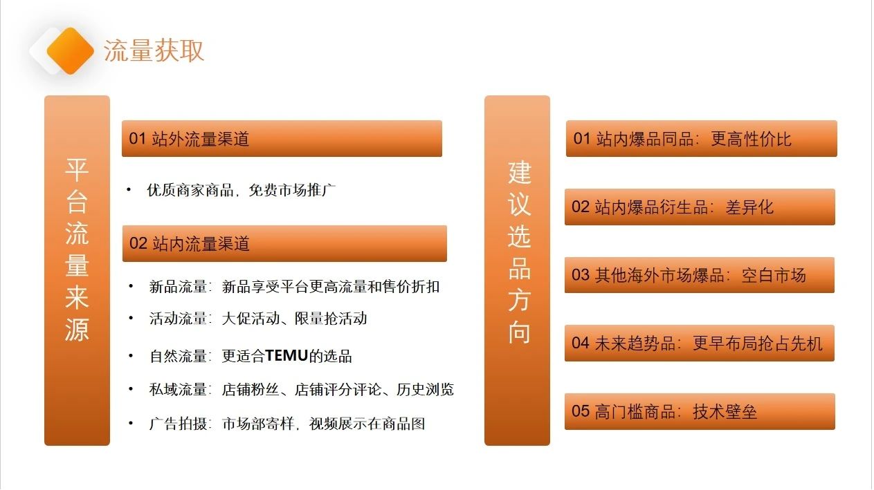 她介绍,TEMU平台站外流量渠道主要是平台对优质商家商品,免费市场推广。站内流量渠道有:1.新品流量,因为新上发布的产品享受平台更高流量和售价折扣;2.活动流量,平台或商家举办“大型促销、限量抢购”等活动能带来不少流量;3.自然流量,这是更适合TEMU的选品带来的流量;4.私域流量,这是店铺粉丝、店铺评分评论、历史浏览等带来的流量;5.通过广告拍摄、市场部寄样、视频展示在商品图带来的流量。