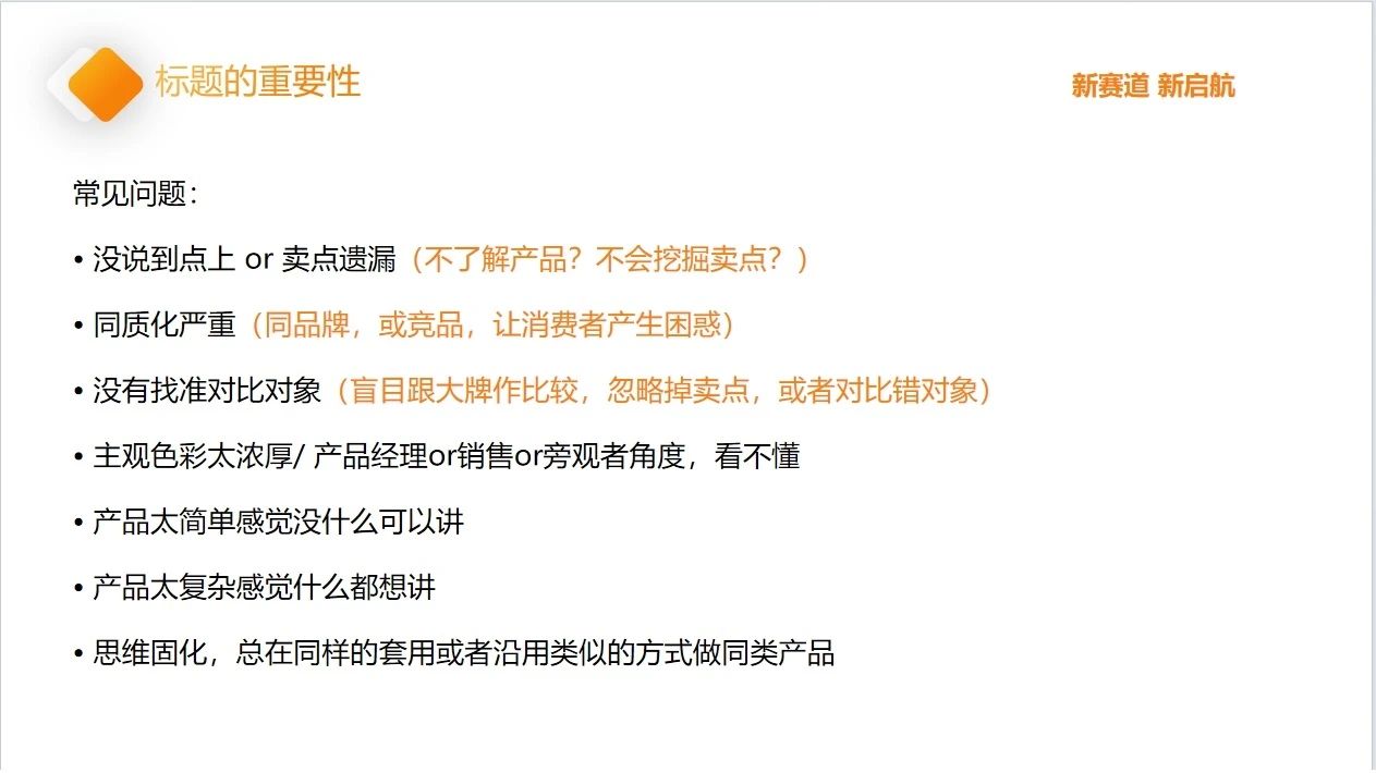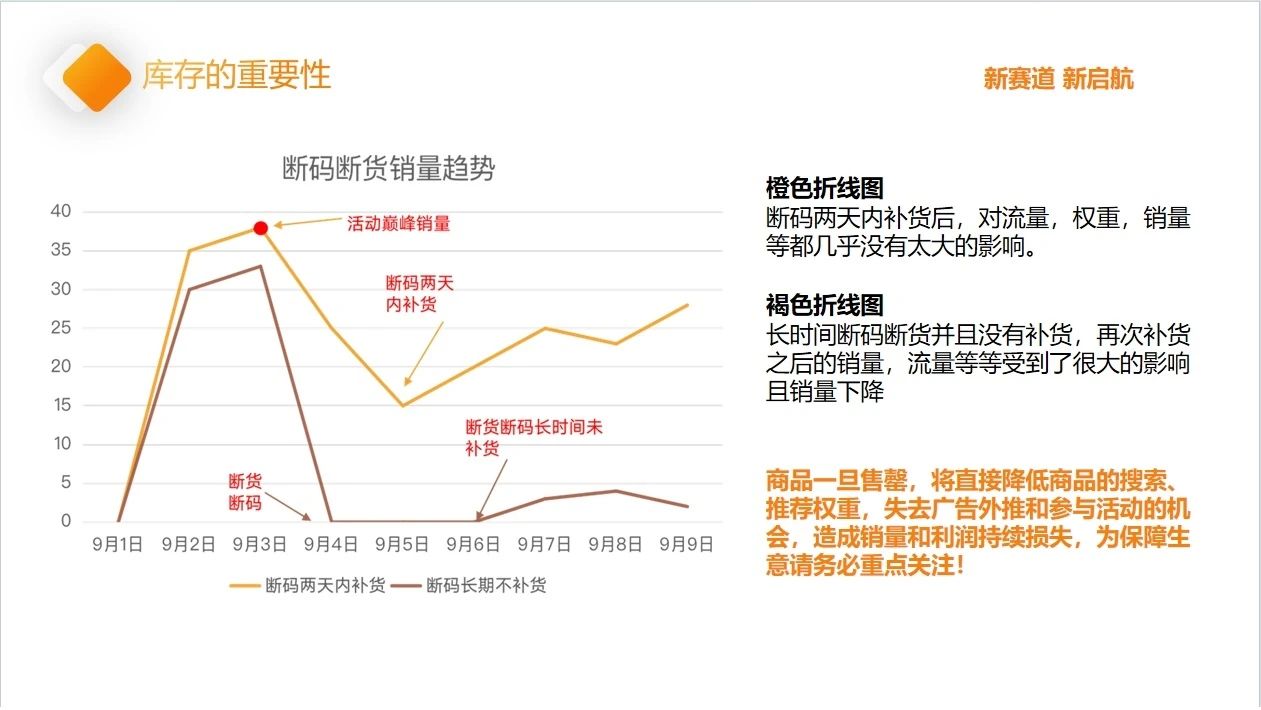 他称,商品配备视频很重要。据观察测试,商品无视频、点击转化无序;常规随拍视频,点击转化提升500%;功能性视频、AI制作视频、场景化视频,点击转化提升2200%。他还指出,要重视商品库存量,因为商品一旦售罄,将直接降低商品的搜索、推荐权重,失去广告外推和参与活动的机会,造成销量和利润持续损失,为保障生意请务必重点关注。