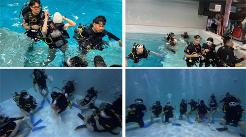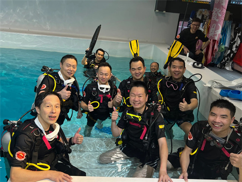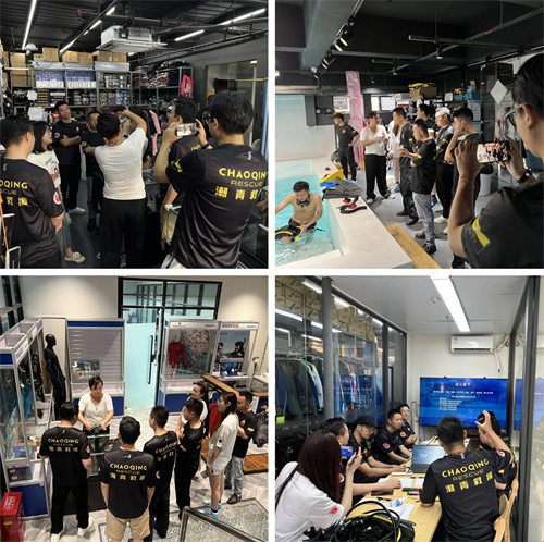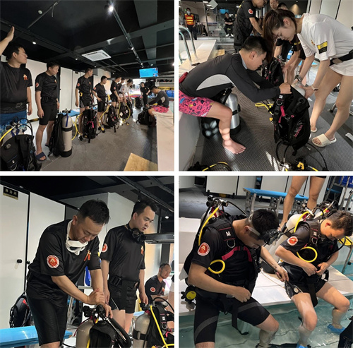 在实操环节,教官组以情景式、互动式的教学方式开展低洼地带救援基础技巧训练、深水区救援基础技巧训练。从控制浮力背心(BCD)、调节器、面镜、dpv水下推进器等装备的正确使用方式,到水下呼吸、平衡耳压、水面伤员拖带、中性浮力水下游动、无能见度证物巡回、紧急情况下交换呼吸器、水下装备穿戴互换、有控制紧急上浮等技巧,教官们专业细致、循序渐进地引导学员们逐一实操学习。