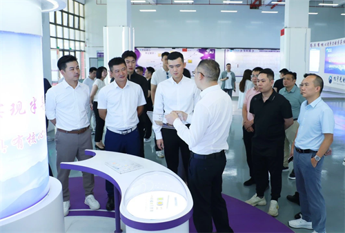 在旭宇光电董事长林金填的带领下,考察团一行参观了公司多媒体展厅、车间、研发中心等场所,了解公司发展历程、组织架构、研发投入与专利成果等情况。