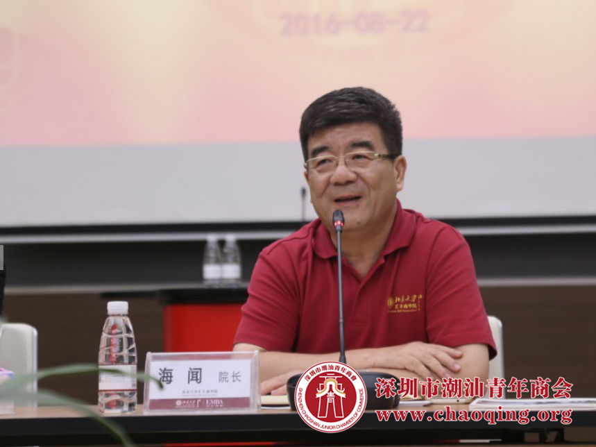 2016年8月22日下午,由深圳市潮汕商会、潮汕青年商会和普宁商会共同组织的“深圳潮商走进汇丰商学院学习交流座谈会”在北京大学汇丰商学院隆重举行。北京大学汇丰商学院院长海闻先生做主题演说。座谈会由深圳市潮汕商会创会常务副会长、深圳市普宁商会执行会长周南主持。