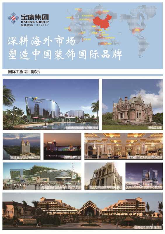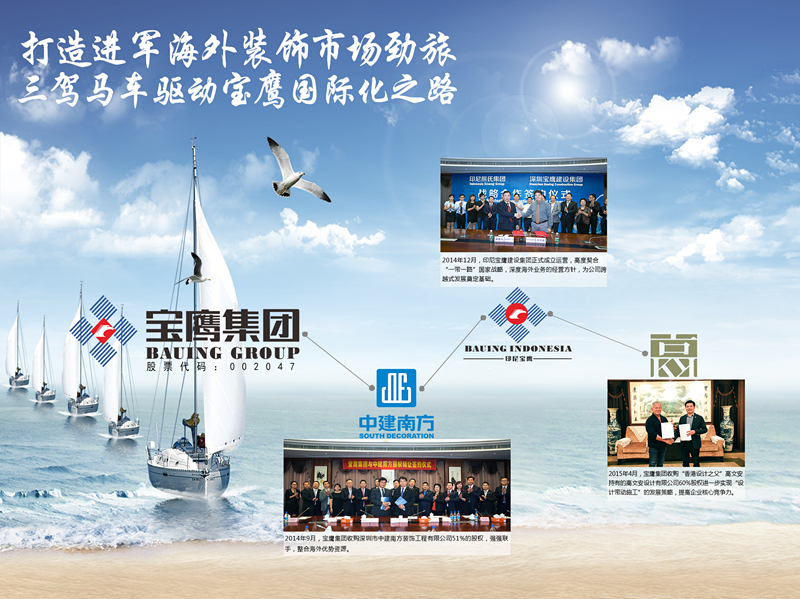 自2013年上市以来,宝鹰集团就开始重点布局拓展海外市场,并响应国家 “一带一路”战略号召,在印尼成立印尼宝鹰建设集团,联姻深圳市中建南方建设集团、深圳高文安设计有限公司,深度开拓海外市场。不到两年,宝鹰集团就在全球15个国家和地区获得发展,今年7月,宝鹰集团相继在印尼、越南相继签署一系列建筑装饰设计与施工大单。今年年初,宝鹰集团还被评为“2015年中国走进东盟十大成功企业”。深圳宝鹰集团在全球建筑与装饰工程服务发面的发展实力以及在国际市场的良好声誉、过硬的产品质量是本次入围联合国全球采购供应商的重要原因。